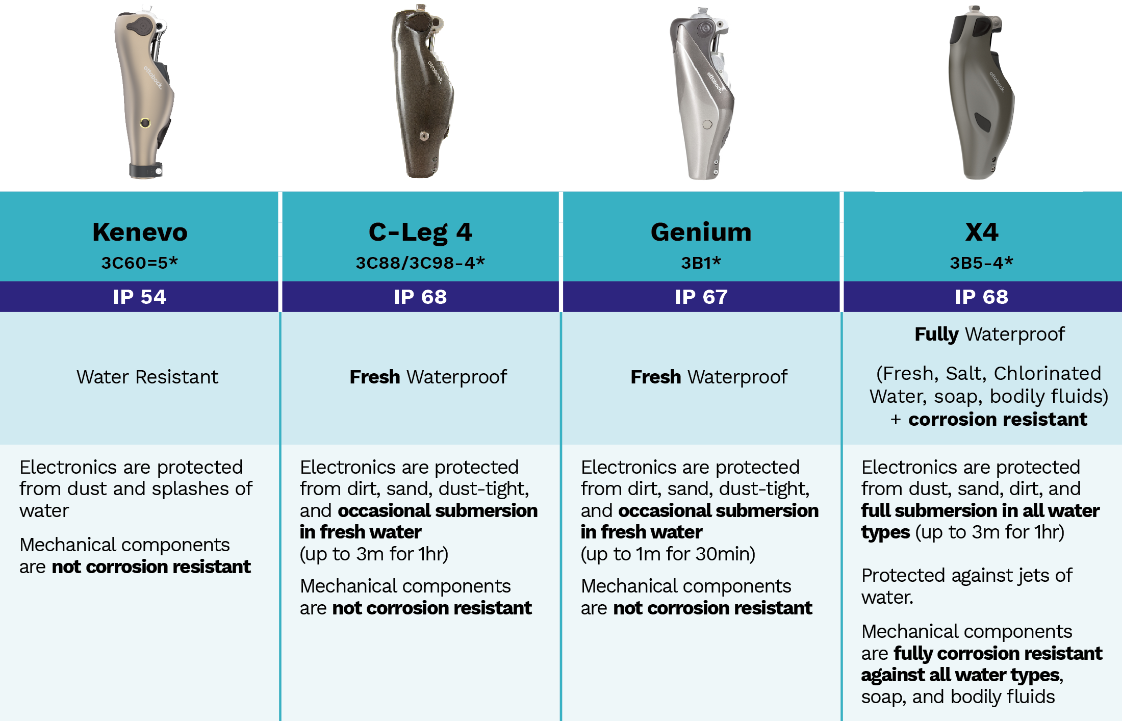 It’s important to remember that the IP rating only refers to protection for the product’s electronics. Microprocessor knees have both electronic and mechanical parts. Therefore, a fully waterproof knee must also be corrosion resistant to ensure that both the electronic and mechanical parts are protected.